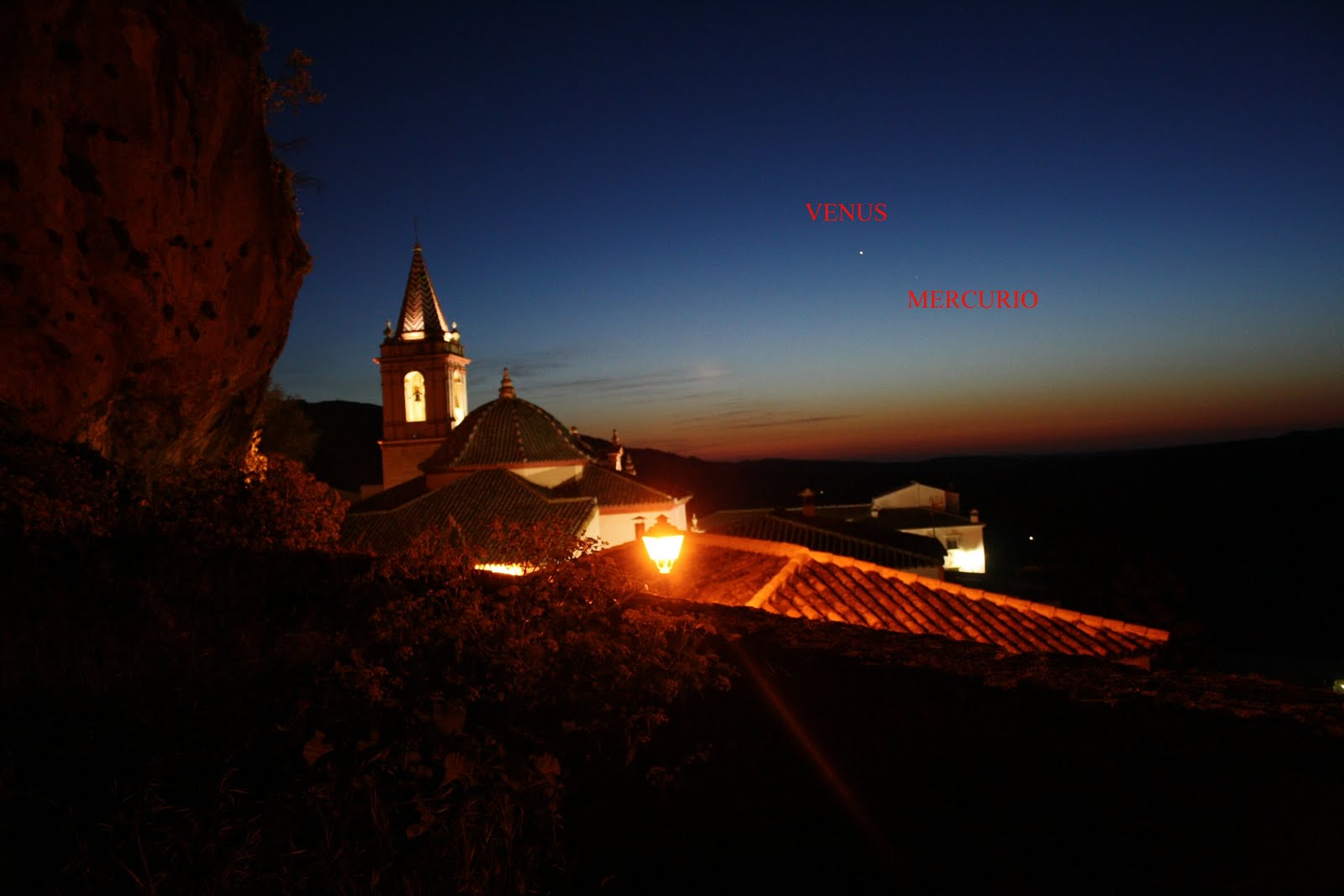 Two stars are in conjunction when viewed from a third party (usually the Earth) are in the same celestial longitude. As the celestial latitude may be different the stars are very close in the sky, but do not match, passing one over the other. The combination is one of the main aspects of the planets. In this case, both shots are made with the Canon EOS 1000D to 1 / 6 second exposure at ISO 800. The pictures were taken with a tripod from a town called Cadiz Zahara de la Sierra.